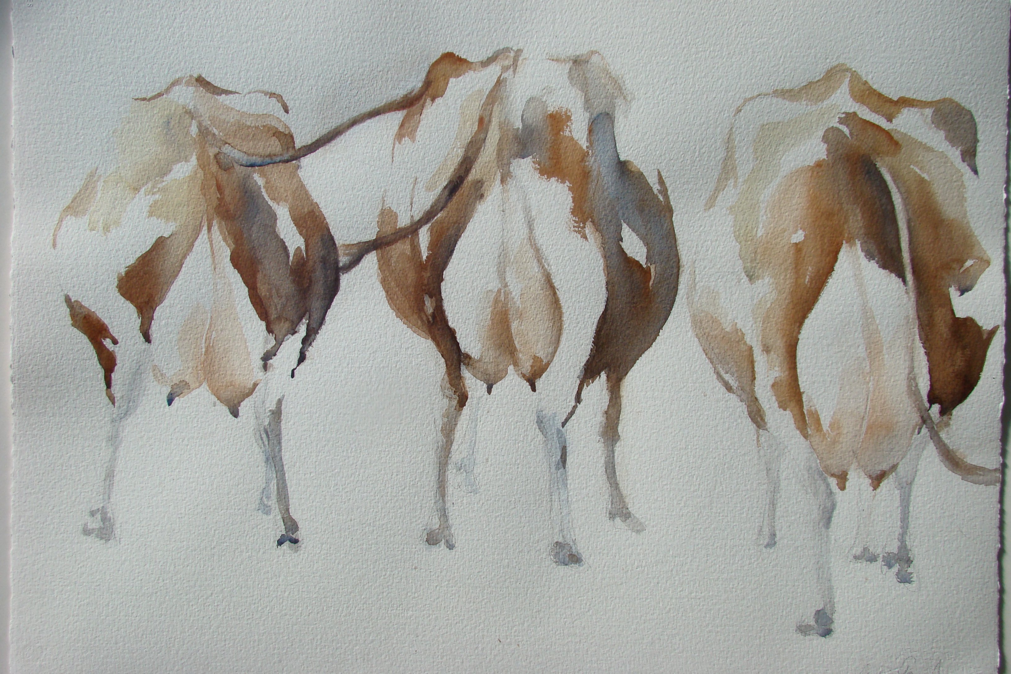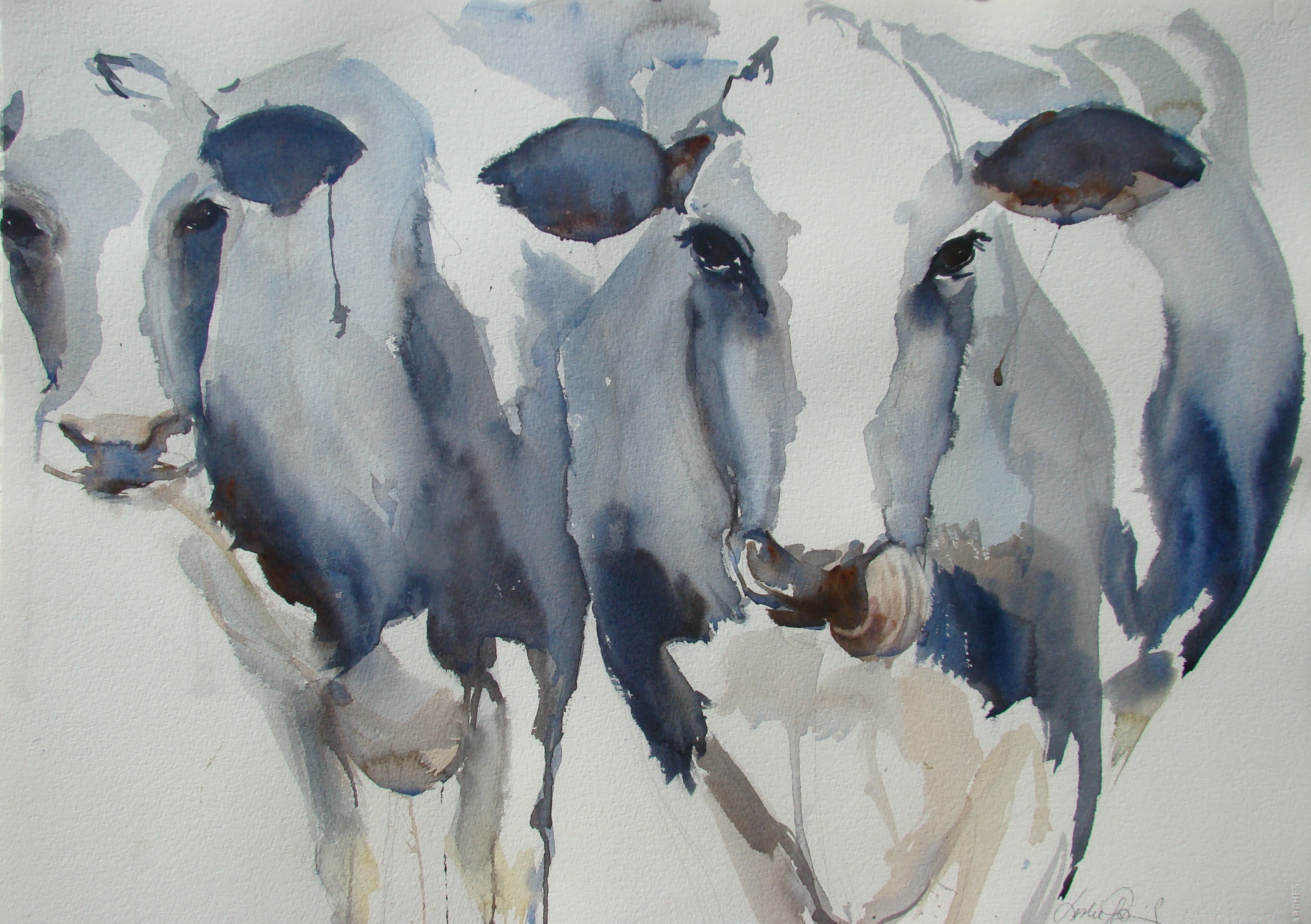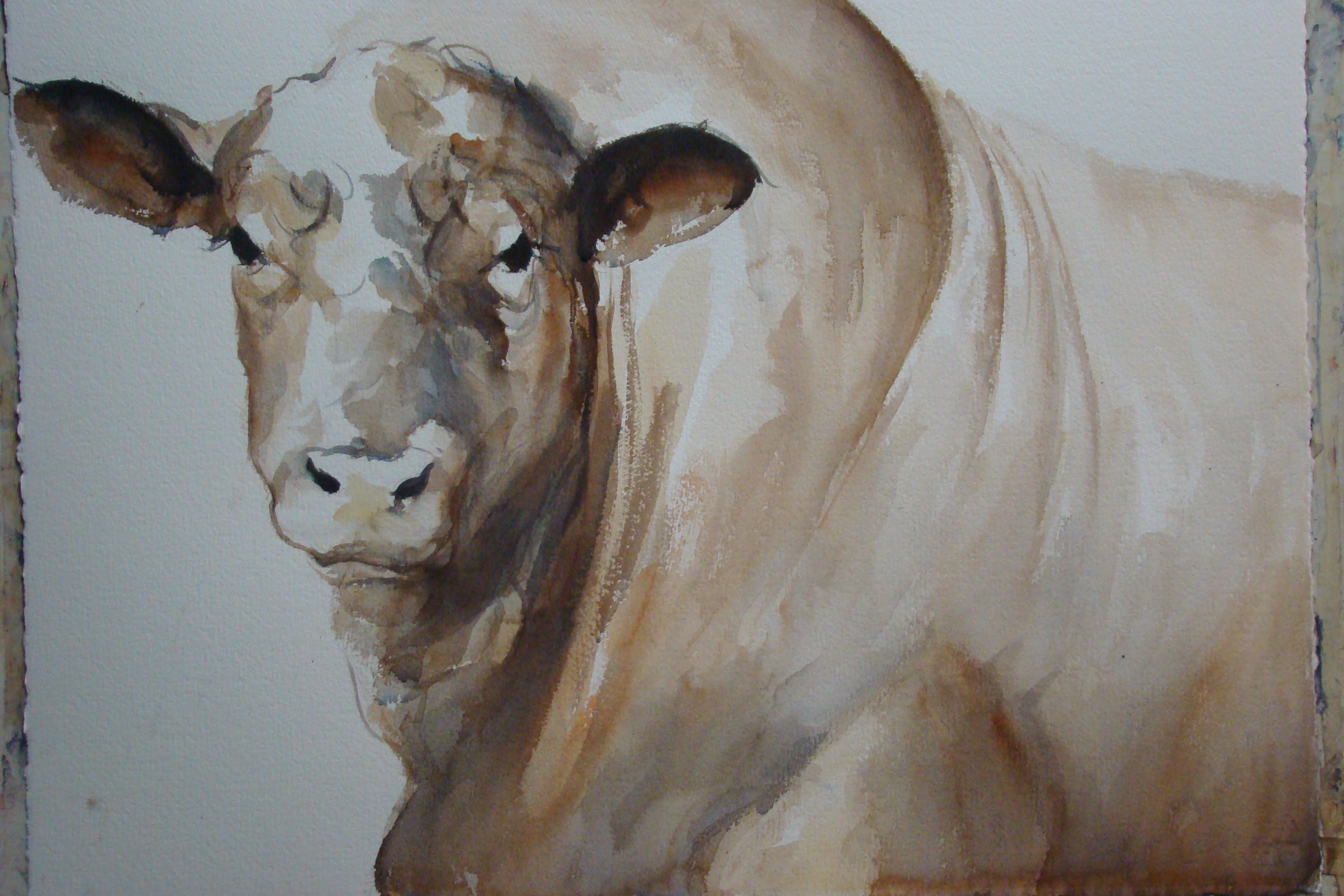 In my series, “Sacred Cows,” I portray cows and bulls as I have looked back at them across the species divide. What I have seen are beings of individualized nobility, power and patience. I have depicted their monumentality, strength and mass in watercolor because it defies the opaque wall between humans and cows and replicates the epiphanal moment when I have seen into them. It allows me to evoke their solidity, while playing good-naturedly with their forms to evoke their very touching innocence.