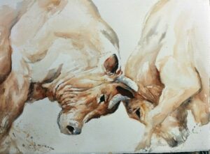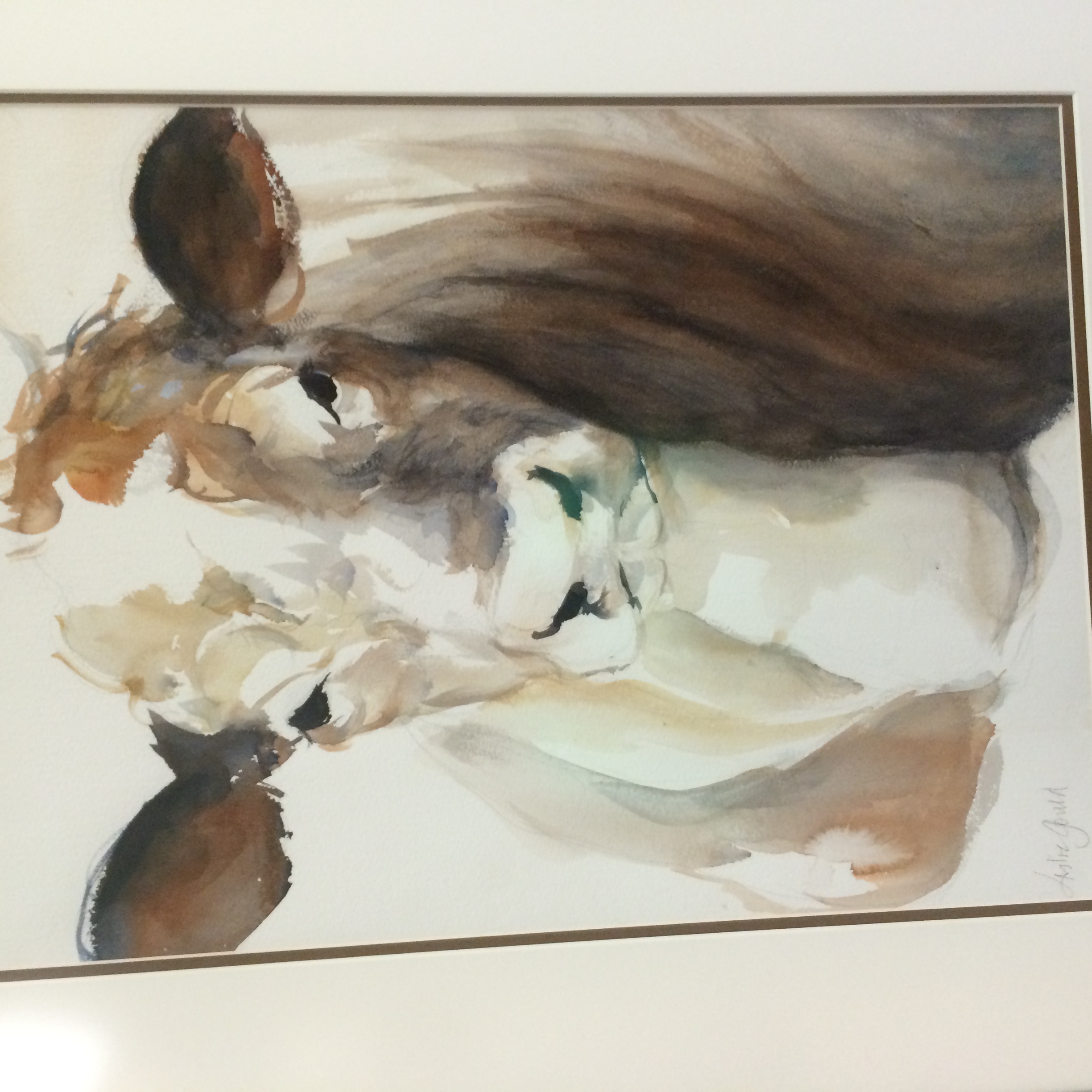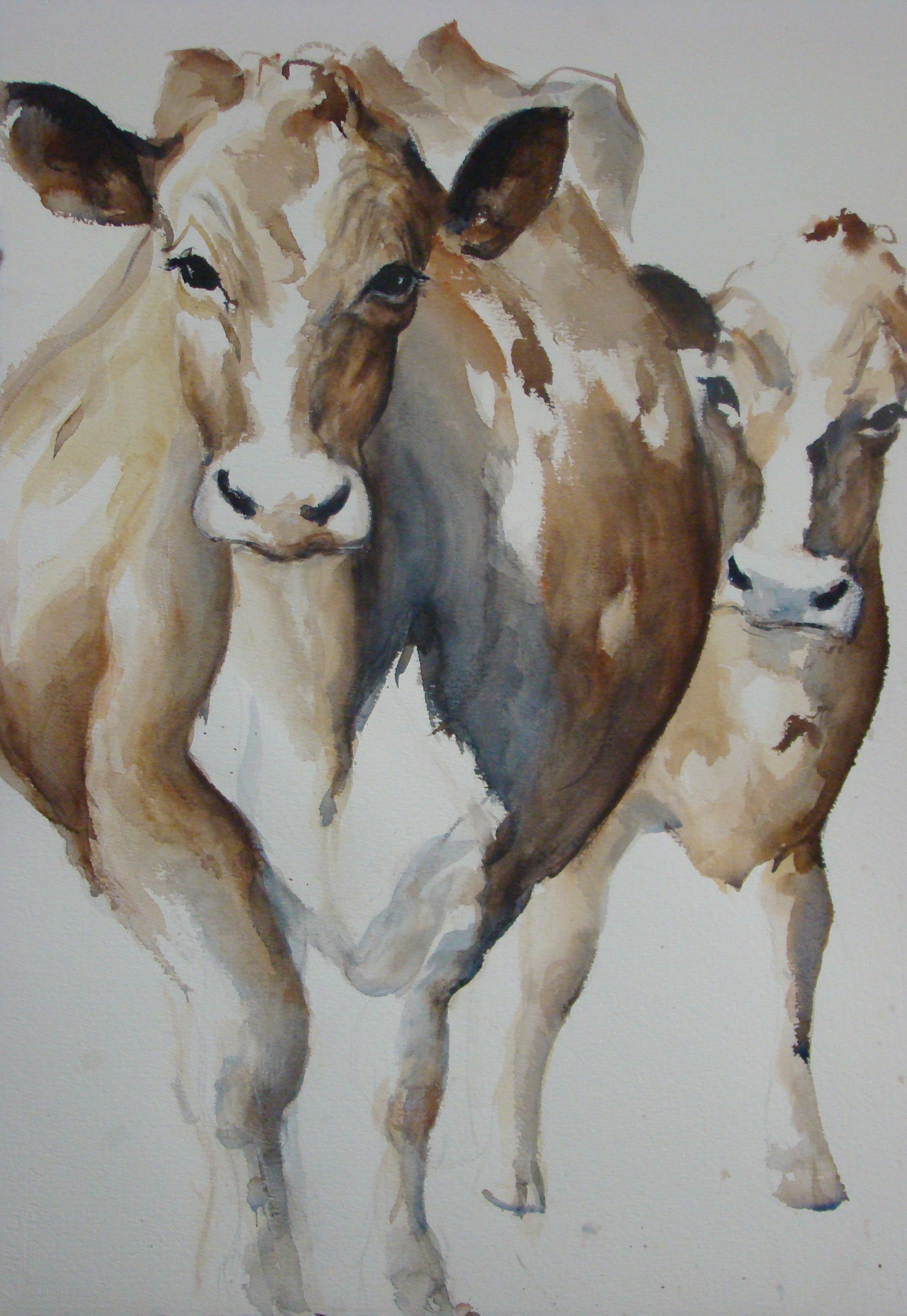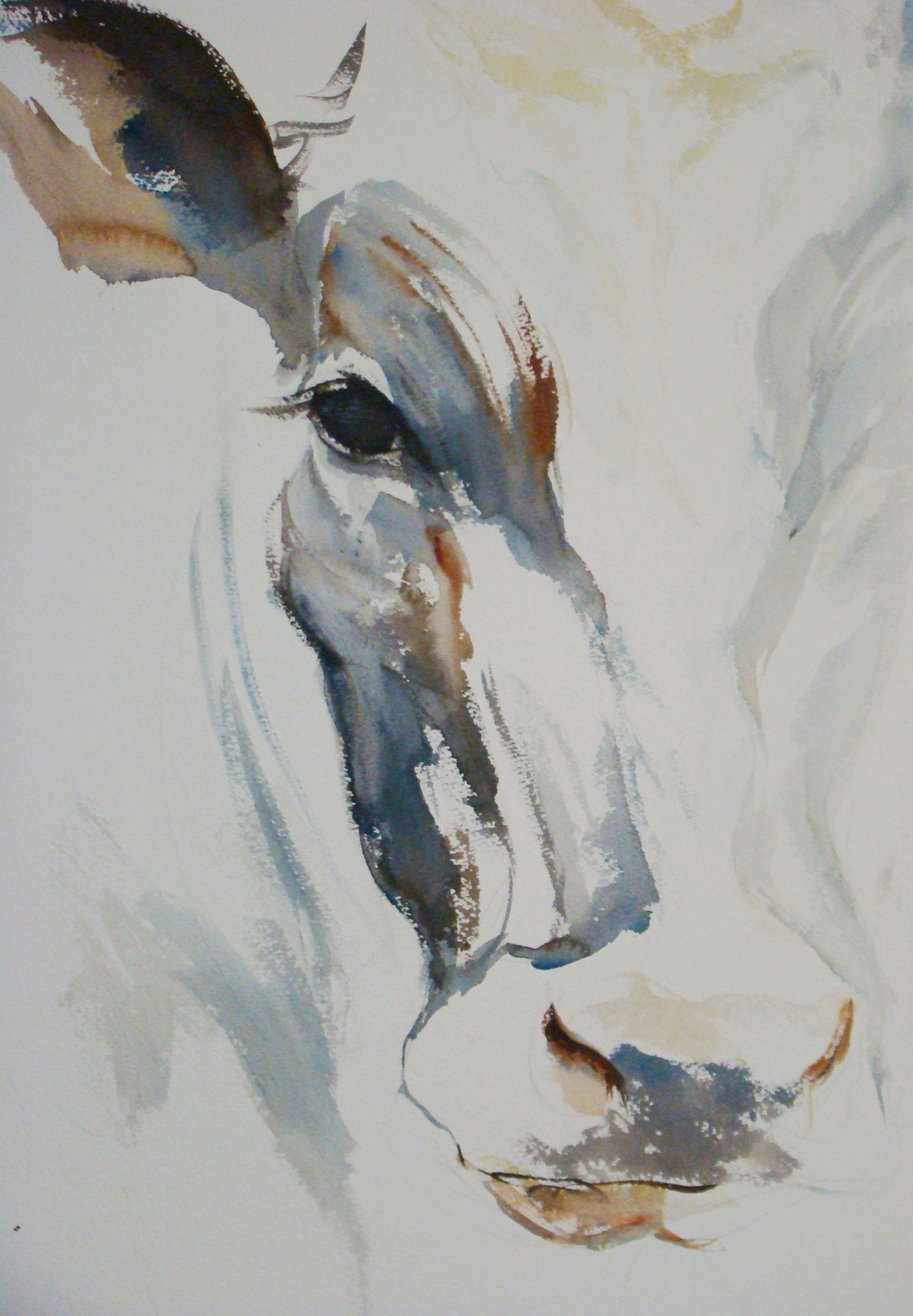 In my series, “Sacred Cows,” I portray cows and bulls as I have looked back at them across the species divide. What I have seen are beings of individualized nobility, power and patience. I have depicted their monumentality, strength and mass in watercolor because it defies the opaque wall between humans and cows and replicates the epiphanal moment when I have seen into them. It allows me to evoke their solidity, while playing good-naturedly with their forms to evoke their very touching innocence.